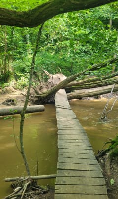 L'adresse de départ n'est pas la bonne, il faut vraiment aller au parking du cimetière. Google maps ne connaît pas, j'ai utilisé Waze. Il y a des arbres déracinés au milieu du passage. Le parcours, cependant, est joli, dans les bois, le ruisseau et les oiseaux chantent, c'est bien agréable.