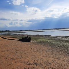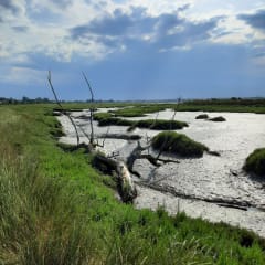 Départ de Sallenelles (parking) et direction France ville Merville. Vous longez l'estuaire de l'orne et sa faune sauvage. Aucun passage sur route. Retour avec courte vue sur la plage qui est magnifique. Retour par le petit port de la baie qui est bien caché. Vous longez à nouveau l'estuaire magnifique à marée basse. On peut apercevoir des phoques marins se reposer sur le grand banc de sable. Prenez des jumelles . Mon rythme était élevé comptez 2h30 avec les pauses et l'observation de la nature