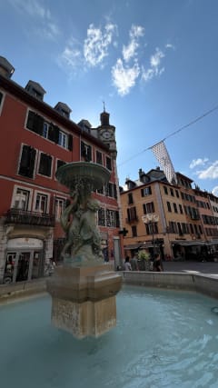 Tour urbain passant par la Gare, le Palais de Justice, les Halles, l'ancienne prison et le Château des Ducs de Savoie. En empruntant quelques traboules (photos), arrivée sur la Place Saint Léger et sa Tour de l'Horloge, et poursuite via la rue Croix d'Or jusqu'à revenir à la Fontaine des '4 sans cul'. Empruntant le Boulevard de la Colonne, arrivée devant la statue de La Sasson. Puis retour vers le parking en passant par La Cassine.