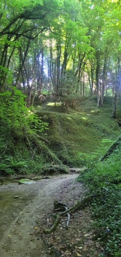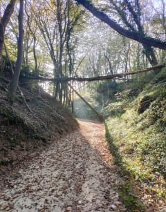 À travers champs et bois, jusqu'à la ferme pédagogique et retour par la combe. Un petit peu de dénivelé et très caillouteux dans la combe, mais idéal par temps chaud, car il y fait frais. Mais pas recommandé par temps de pluie, car la combe se transforme en un petit ruisseau.