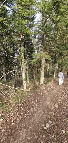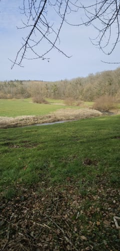 Départ monotone arrivé au chemin de bois en partant sur la gauche un pré ouvert au bout avec des jeunes bêtes en tourner sur la droite en longeant le bois dans un pré avec des herbes hautes sur plusieurs mètres 😔