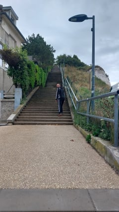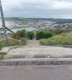 Promenade en.bord de mer et montée d'escaliers pour atteindre le haut de la falaise.