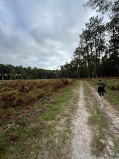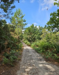 Un parking au départ de la balade. Il y a des montées dans le sable mais la beauté et la sérénités de la forêt landaise avec les fougères vaut le détour. En plus, les chiens peuvent nous accompagner !