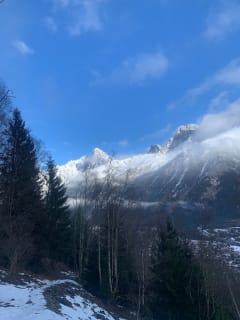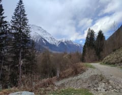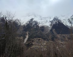 Montée / descente, 300 m dénivelé positif, vue sur le Mont-Blanc et glacier des Bossons. Parking au départ, accès facile, montée en lacets, retour en bas de la descente, le long de la rivière.