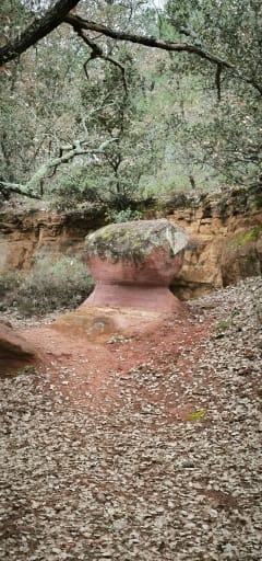 Au départ d’Okra, ancienne usine d’ocres, on suit un sentier qui traverse la pinède et surplombe l’arrière des anciens bassins de l’usine, pour arriver sur des rochers qui pourraient vous faire croire être au Colorado. Petite montée raide pour aller vers le domaine de la Coquillade -vignoble et hôtel - avant de redescendre vers une petite route peu empruntée jusqu’au « chemin ancien de Roussillon », par lequel vous remontrer tranquillement vers le village. Attention, pas d’ombre entre la Coquillade et le Chemin ancien de Roussillon.