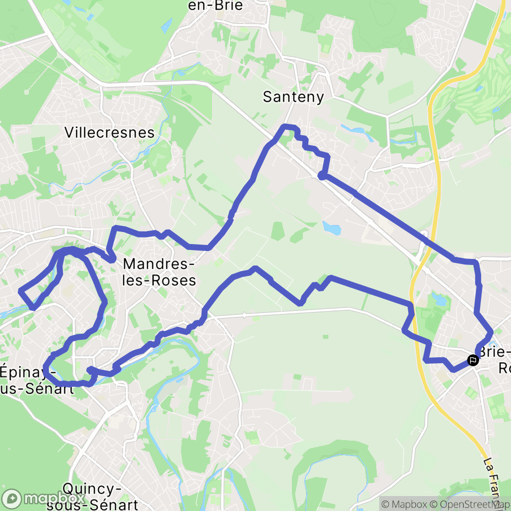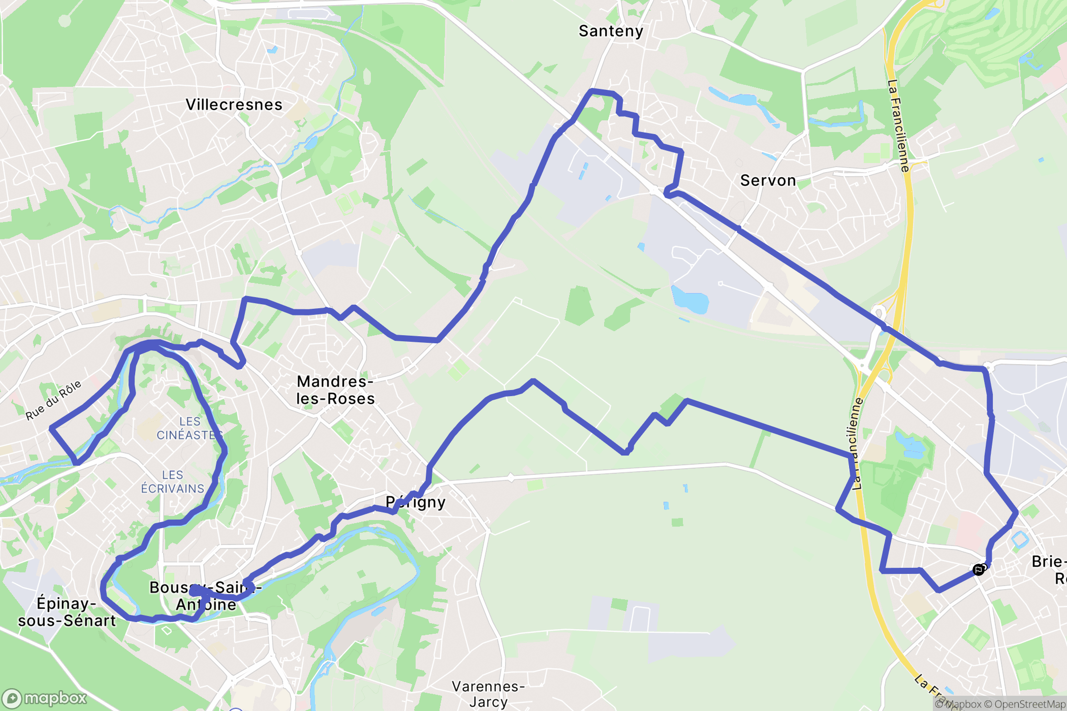 Randonnée direction Servon par le chemin Vert, puis Santeny pour rejoindre Mandres les Roses. Ensuite, poursuivre vers Brunoy pour longer l'Yerres et revenir par les maraîchers de Périgny.