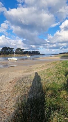 départ baie de Kerlavos se diriger à gauche de la baie suivre le sentier pendant 700 mètres jusqu'au parking du grande prendre le chemin Gr 34 à 200m prendre à gauche jusqu'à la rue de Brungwiler prendre à droite faire 100m prendre à gauche chemin de terre jusque Run Rouz chemin goudronné jusque départementale traverser celle-ci prendre chemin de terre jusqu'au panneau allée couverte de Kerguntuil traverser la prairie en respectant les cultures. Visiter le Dolmen sortir du champ prendre à droite jusqu'à la rue du dolmen prendre à gauche et rejoindre point départ baie de Kerlavos.