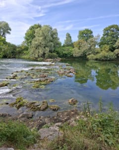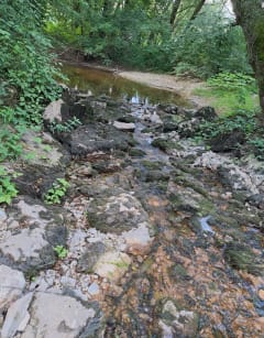 Agréable balade entre chemins blancs et chemins de terre qui serpent le long du ruisseau. chemins au milieu des herbes hautes mais avec le passage ça reste très correct 2 passages à gué dont le 2ieme ou il faut mettre les pieds dans l eau prévoir une pause de chaussures de rechange petite plage en chemin pour se poser un coup