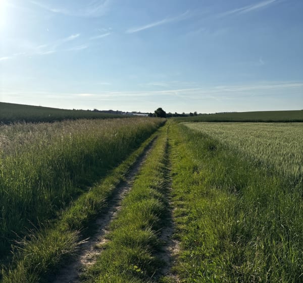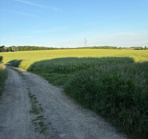 Passage sous un pont d’une voie de chemin de fer, sentiers à travers les champs, forêt et pistes cyclables, 60 m de dénivelé environ avec beaucoup de chemin et des trous du haut tracteur.