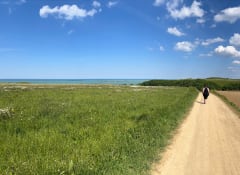 Depuis le site de la batterie allemande de Longues-sur-Mer, ouvrage majeur du mur de l'Atlantique, on part cheminer sur les hauteurs des falaises du Bessin.