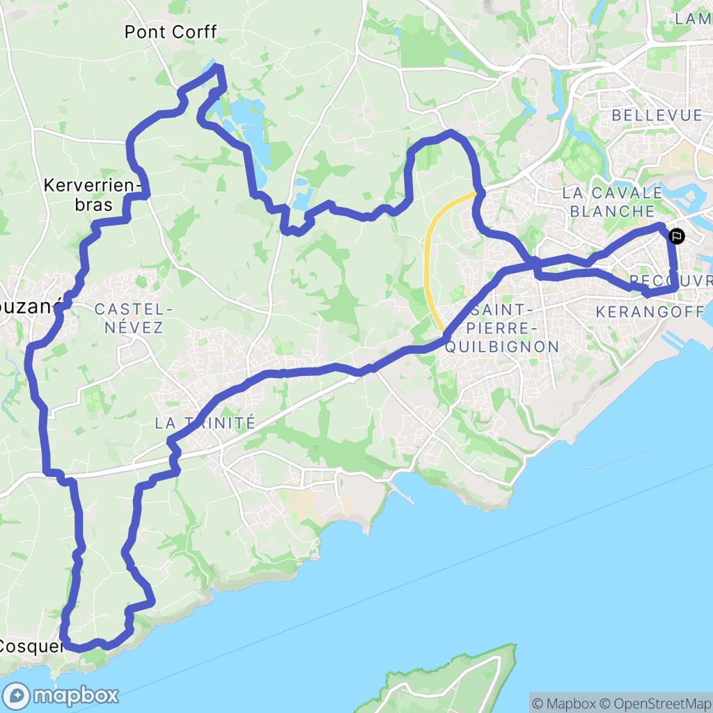 Départ de la Rive droite de Brest direction l'étang de Bodonou, après on file vers le Petit Minou pour un ravito face à la mer. Passage par des chemins de traverse pour rejoindre paisiblement la ville. Des routes secondaires, des chemins, des singles et même pas beaucoup de montés !