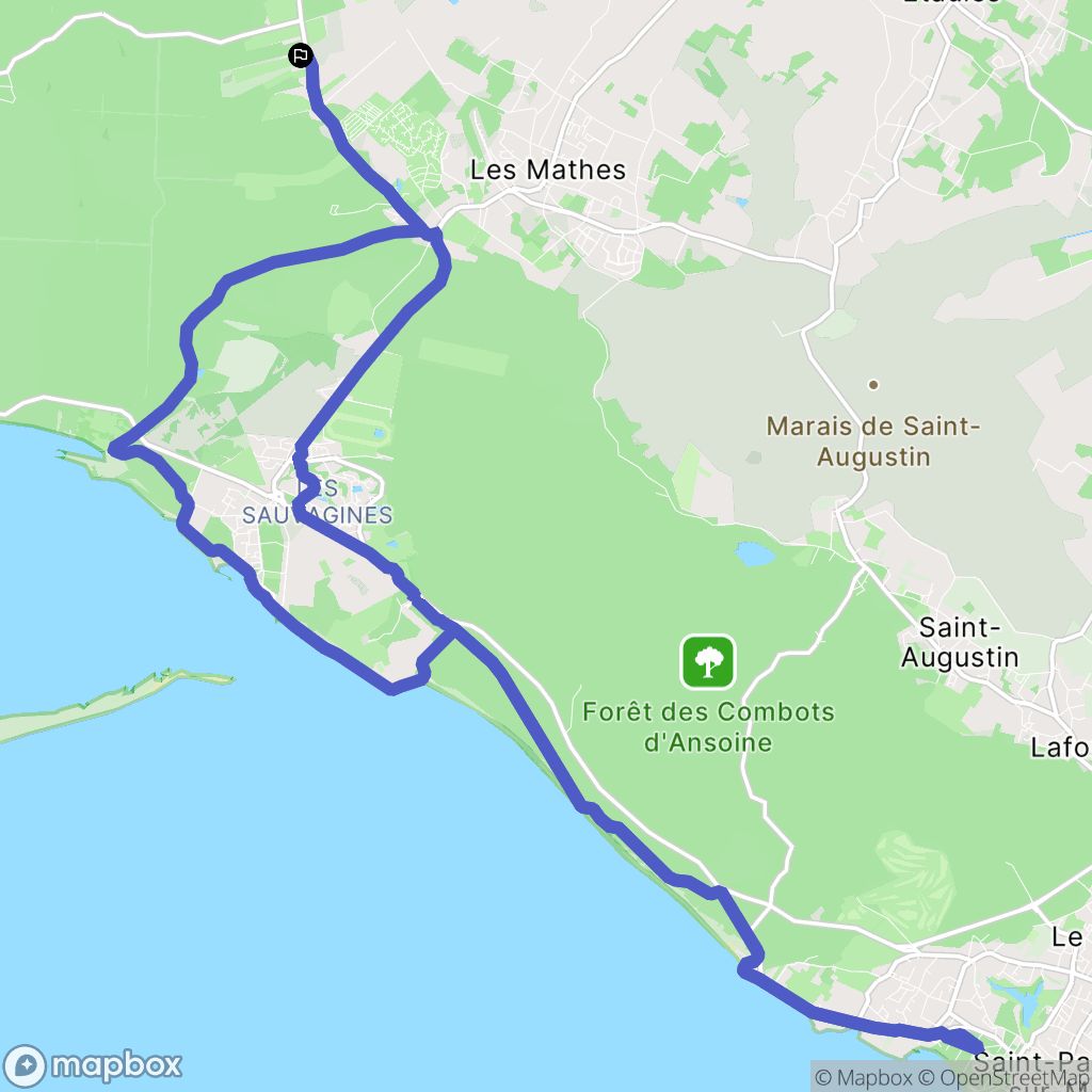 Un parcours idéal pour démarrer la journée du bon pied. Piste cyclable alternée de traversée de bois et bord d'océan jusqu'à Saint-Palais-sur-mer. Quelques bosses à passer sur 2kms. Passage devant le zoo de la Palmyre au retour.