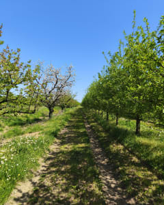 Très belle balade entre vergers (il commence à faire chaud à cette période de l'année) et parties boisées. Pas mal de passages en plein soleil donc à faire plutôt le matin ! Attention, le guidage est fait à l'inverse du balisage. Donc, si vous voulez profiter du guidage, après avoir traversé la route, remonté un chemin abrupt et longé un champ, quand vous arrivez en partie boisée il y a une sorte de pâte d'oie : le balisage indique de prendre sur droite mais le guidage est sur gauche(croix bleue