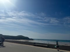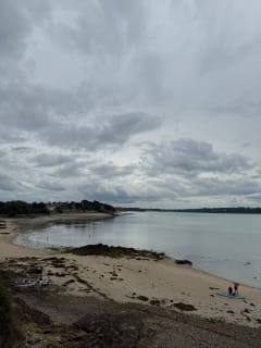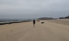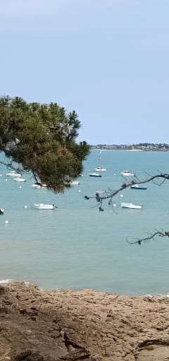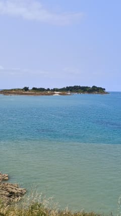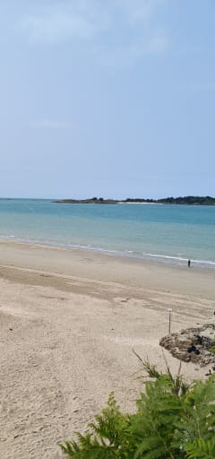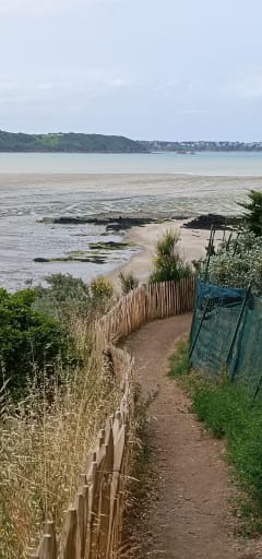 Départ du camping des Manchettes, sous le soleil. on peut prendre immédiatement le GR 34 qui le longe. je pars vers la droite. Si certains chemins sont partagés, d'autres portions du littoral sont totalement interdites aux cyclos mais il y a toujours une route parallèle qu'ils peuvent emprunter. je rejoints après un petit passage dans une zone pavillonnaire, le chemin des douaniers et je prends plaisir à observer le panorama : le ciel bleu, la mer verte émeraude, la végétation presque provençale. Qu'elle est belle le Bretagne ! Je suis le GR presque en totalité avec un petit détour sur la pointe du chef de l'Isle. La boucle se termine par un petit passage en zone d'habitations mais toujours très calme et balisé. Retour au camping, très sympathique accueil à souligner.