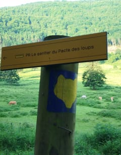 Sur les traces du tournage du film. Le balisage est une tête de loup jaune sur fond bleu. On empreinte des chemins variés, au travers de la forêt et des prairies. Le tracé en forme de huit permet de racourcir la ballade si nécessaire. On alterne montées et descentes au gré du relief. nous avons croisé des chevaux, des vaches et des ânes !