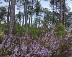 Randonnée faite en automne, de jolis paysage avec de la bruyère à perte de vue. on a eu loccasiôans de voir 3 faisans! le passage pour accéder à la route de bordeaux etait vraimétrès impraticable plein de ronces etc...on a décidé de suivre l'ancien ruisseau et de remonter un peu plus loin..