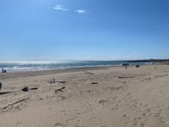 Grande balade au gré des chemins. Pêcheurs, hérons cendrés, parcs de la Tamarissière. Retour par la plage, petite trempette bien méritée. Repos, sous un soleil bien chaud, très peu de vent. Le pied.