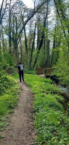 Parties ombragées et d’autres ensoleillées, un petit peu de dénivelé. Promenade agréable, chemins forestiers, champs et jardins. On a les pieds dans l’herbe par moment, donc gare aux tiques.