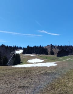 Depuis les remontées mécaniques de metabief. Panoramique depuis le mont d'or. Descente sur un chemin de forêt.