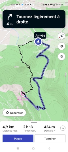 Randonnée sympathique, un peu de dénivelé.Dommage que nous ne pouvons plus rentrer à l'intérieur du château mais des bénévoles sont là pour retaper l'édifice et nous permettre plus tard d'y avoir accès👍🏻.Pour notre part, nous avons voulu faire une boucle donc après avoir suivi le parcours de Outdoor, ns sommes redescendu de l'autre côté D'ailleurs petit bémol dans le parcours, arrivé à l'intersection du gros cairn pour tourner à droite en direction du château,il nous disait de faire demi-tour
