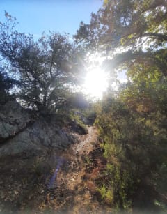 Du centre sportif, prendre la Voie Verte vers Arles et longer le Tech au plus près. À la sortie de la piste réservée aux piétons et vélos, dès les 1 ères maisons, monter une petite route à droite puis prendre le petit escalier à droite. Gravir le sentier pierreux de la Rodella sur de nombreux lacets. Belles vues sur les montagnes alentour aperçues entre les arbres. Légers plats permettant de reprendre son souffle, quelques passages entre les rochers. En haut, arrivée dans une petite clairière avec un banc sommaire, un gros cairn marquant le carrefour de 2 sentiers. Laisser partir le sentier de la Rodella à gauche (pancarte Montbolo) et prendre à droite le chemin descendant (pancarte Amélie). La descente se fait sur un sentier pierreux entre les châtaigniers et arbousiers, avec quelques "goulots" étroits dans la roche. Traverser un chemin plus large pour continuer en descente jusqu'aux 1ers immeubles d'Amelie que l'on contourne. Traverser l'aire de jeu et revenir au point de départ.