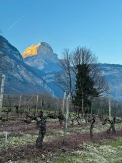 La promenade débute au niveau de l’aire d’atterrissage des parapentes. On alterne entre passages en forêt ou chemins d’agriculteurs tracés au milieu des champs constellés de fleurs et les vieilles vignes. Les massifs de Belledonne et de Chartreuse surplombent majestueusement votre terrain de jeu.