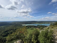 Entre base de loisirs et nature préservée, plages de sable fin et sentiers de randonnée balisés, le lac de Chalain réunit les amateurs de rando et de pédalo autour de ses eaux incroyablement vertes, résultat d’un processus géologique enclenché il y a plusieurs milliers d'années. Au pied du premier plateau du massif jurassien, ce lac d’origine glaciaire étale ses 232 hectares de lagon turquoise entre Fontenu, Marigny et Doucier, falaises calcaires et forêt de résineux. La beauté du site naturel, le faible dénivelé et la possibilité de se baigner en font une destination rando familiale parfaite.