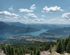 Vue panoramique sur le lac à l'arrivée du télésiège et tres belle vue sur les Aiguilles de Chabrieres. Par contre descente sur un chemin très caillouteux surtout sur le 1er km qui rend la sortie moins familiale et accessible à tous .