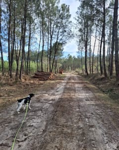 Jolie boucle au milieu des bois, entre pins et fougères et sur chemin de sable. Chiens en libre possible . Petit ruisseau au niveau du parking voiture . Table de pique nique également.