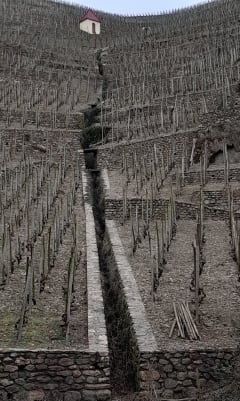 Se garer au centre d'Ampuis sur le parking de la place de l'église au bord de la D386 (ancienne N86). (D/A) Pour le départ, se placer près du fronton de l'église, face aux vignobles. Traverser la D386 (passage pour piétons) à l'extrémité ouest de la place et prendre en face la Route de Boucharey (D615) en direction des Haies. (1) Après 200m, au croisement avec la Rue de la Brocarde, continuer tout droit par l'impasse (Rue du Moulin). La petite route goudronnée monte doucement en suivant le ruisseau du Reynard sur la droite. Après 250m, lorsque la route passe sur le ruisseau, continuer tout droit : le ruisseau est alors à gauche de la route. Arrivé à un ancien moulin en pierre, la route contourne ce dernier puis se transforme en chemin caillouteux et rocheux qui monte très raide dans les vignobles du sud de la Côte Brune. Poursuivre en suivant le tracé.