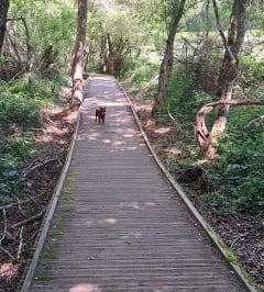 En sous-bois, ou le long de champs, avec quelques accès à de petites plages, la balade est magnifique et reposante (couleurs, et chants des oiseaux, proche de l’eau).