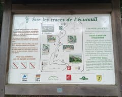 Trajet simple, peu de dénivelé, départ du parking, prendre le grand chemin le long du panneau. Suivre les poteaux avec l'empreinte de l'écureuil. Balade avec les enfants.
