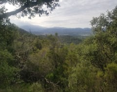 Chemin en sous bois, sous les chênes liège. Belle Tour de l'œil. On serpentera entre chemin , piste et goudron jusqu'au Dolmen de la Siureda.