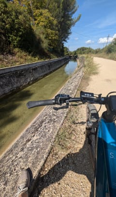 Départ parking de Decathlon Bouc Bel Air. Petit morceau de route jusqu'à la colline. Terrain facile mais vallonné. Jolie vue sur la Sainte Victoire. Dernière descente de colline caillouteuse mais facilitée si on roule aux abords du sentier. Longer le canal. Il faut porter le vélo pour passer la barrière sur le chemin du canal. Dernière portion de route.