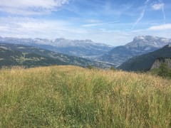 Après ce passage ombragé très agréable, on débouche dans des paysages ouverts et aux chalets du Truc, où les points de vue sont sublimes sur les dômes du Miage, mais aussi sur Sallanches visible au loin.