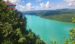 Ontdek de mooiste uitzichten op het meer van Vouglans, gelegen tussen Lons-le-Saunier en Saint-Claude, in de Jura. Dit meer, gelegen op 430 meter hoogte, is 35 km lang en heeft smaragdgroen water dat het de uitstraling geeft van een exotisch meer. Geniet van een korte wandeling als digestief met een uitzonderlijk uitzicht op het meer. Het meer van Vouglans is de ideale plek voor zomeractiviteiten. De havens, aangelegde stranden, de dam, de bootverhuur en de omgeving maken het een uitzonderlijke locatie. De uitkijkpunten bieden een adembenemend uitzicht op het meer. Deze korte vakantie is toegankelijk voor iedereen, jong en oud. Het meer van Vouglans is een ideale speeltuin voor zomeractiviteiten zoals zwemmen, vissen, waterfietsen, kajakken, kanoën, suppen en nog veel meer. Het is een must-do tijdens uw vakantie in de Jura, vooral met kinderen. Het Lac de Vouglans is een beetje zoals de badplaats van de Jura en biedt een breed scala aan mogelijkheden: stranden, havens, restaurants, accommodaties, begeleide boottochten en sportieve activiteiten. U kunt hier een dag doorbrengen of het uw ideale uitvalsbasis maken om de Jura te verkennen. Zwemmen in het Lac de Vouglans kan op verschillende plekken: de stranden van Mercantine, Bellecin en Surchauffant. Picknicken is ook mogelijk, vooral aan de picknicktafels.