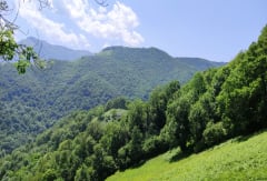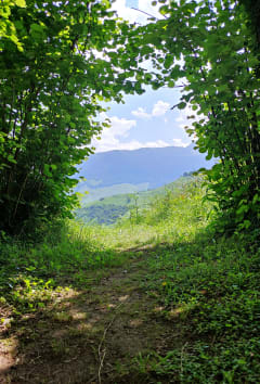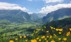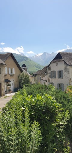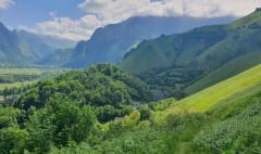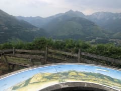 Na het eerste stuk over de weg naar de Abri Montagnard, gaan we onder de welkome schaduw van de beuken en buxussen op weg naar de oriëntatietafel. Vanaf hier hebben we een volledig uitzicht over de vallei van de Gave d'Aspe en zijn vredige dorpjes. Misschien, als zij ook een wandeling maken, hebben we het geluk om een paar gieren te zien die kriskras door de blauwe lucht vliegen.