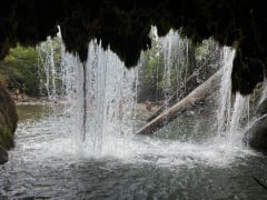 Hier genieten we van de koelte van het bos, helemaal tot aan de waterval, voor een ontspannende, melodieuze pauze.