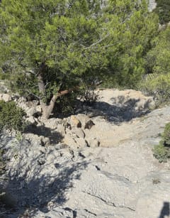 Diep in de vallei, met hoge kliffen, is het een populaire klimplek.