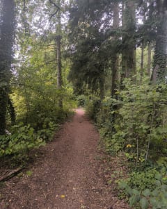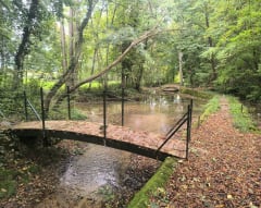 Passage dans les habitation très monotone , partie sous les bois , ombragée , agréable avec une touche d'aventure avec de beaux chemins digne d'un tableau.