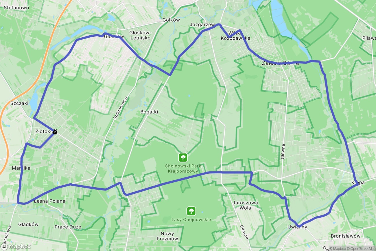 Na tę wycieczkę polecamy rower gravelowy, ale dasz sobie radę również na trekkingowym. Trasa wiedzie przez Złotokłos, Baszówkę, Jazgrzew, a także Jesówkę, Zalewie Górne, Uwieliny, Piskórkę i Łoś. Z uwagi na to nawierzchnie gruntowe przeplatają sie z asfaltowymi, jednak tych pierwszych jest o wiele więcej. Z uwagi na długość oraz przewyższenia będzie to trasa lepsza dla tych rowerzystów, którzy mają już jako takie doświadczenie.