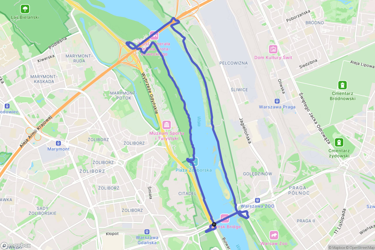 Trasa, która pozwala przejechać „pełną pętlę” po obu stronach Wisły. Startujemy na Żoliborzu, potem jedziemy przez Most Gdański na Pragę, gdzie można odpocząć w klimatycznej kawiarni. Następnie kierujemy się Bulwarami i wracamy przez Most Śląsko-Dąbrowski. Dla wielu to ulubiona trasa rowerowa w Warszawie – i trudno się dziwić.