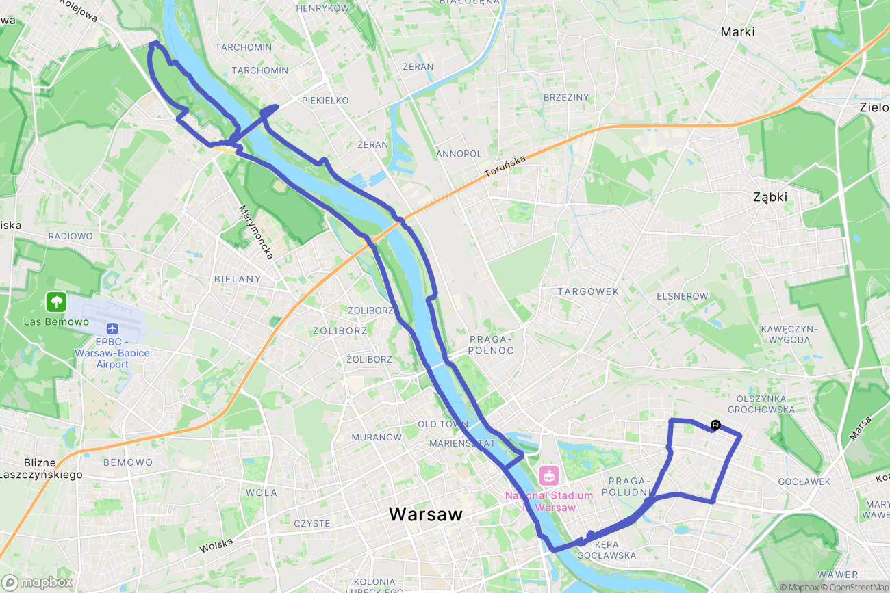 Ta trasa przez Most Gdański i Bródno oraz z powrotem na Wolę to już prawdziwa wyprawa – wycieczkę proponujemy zacząć na parkingu w okolicy Wolskiej 95-96, a następnie możesz skierować się na Most Gdański i na prawy brzeg Wisły. Następnie kieruj się przez Bródno – jedną z najbardziej zielonych i zaskakująco spokojnych dzielnic Warszawy. Kolejny punkt na trasie to Park Bródnowski i kierujemy się już do Marek – miasta zlokalizowanego na obrzeżach stolicy, pełnego małych jeziorek i leśnych ścieżek.