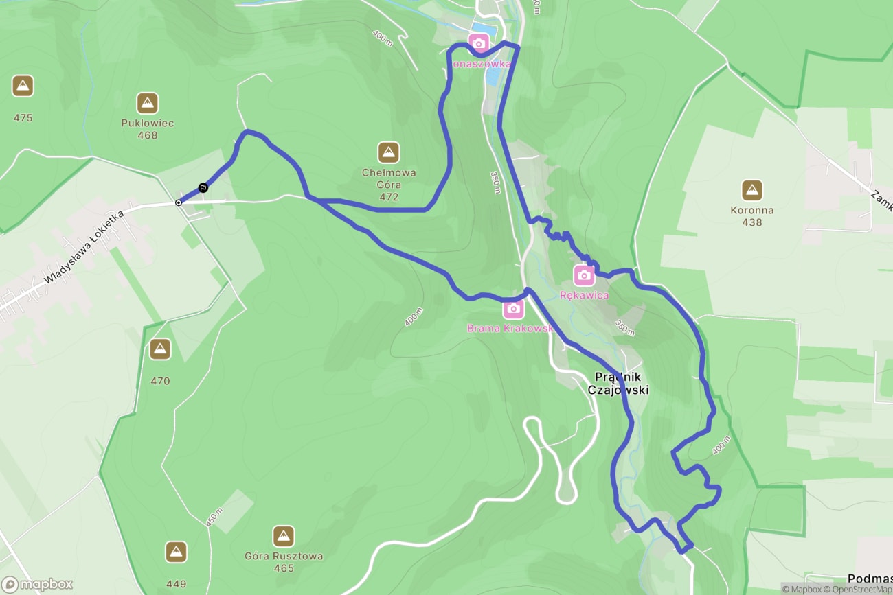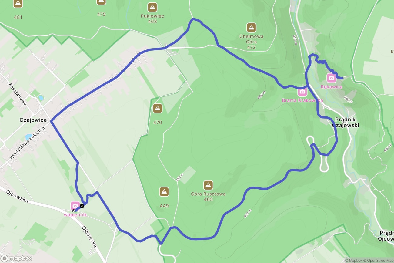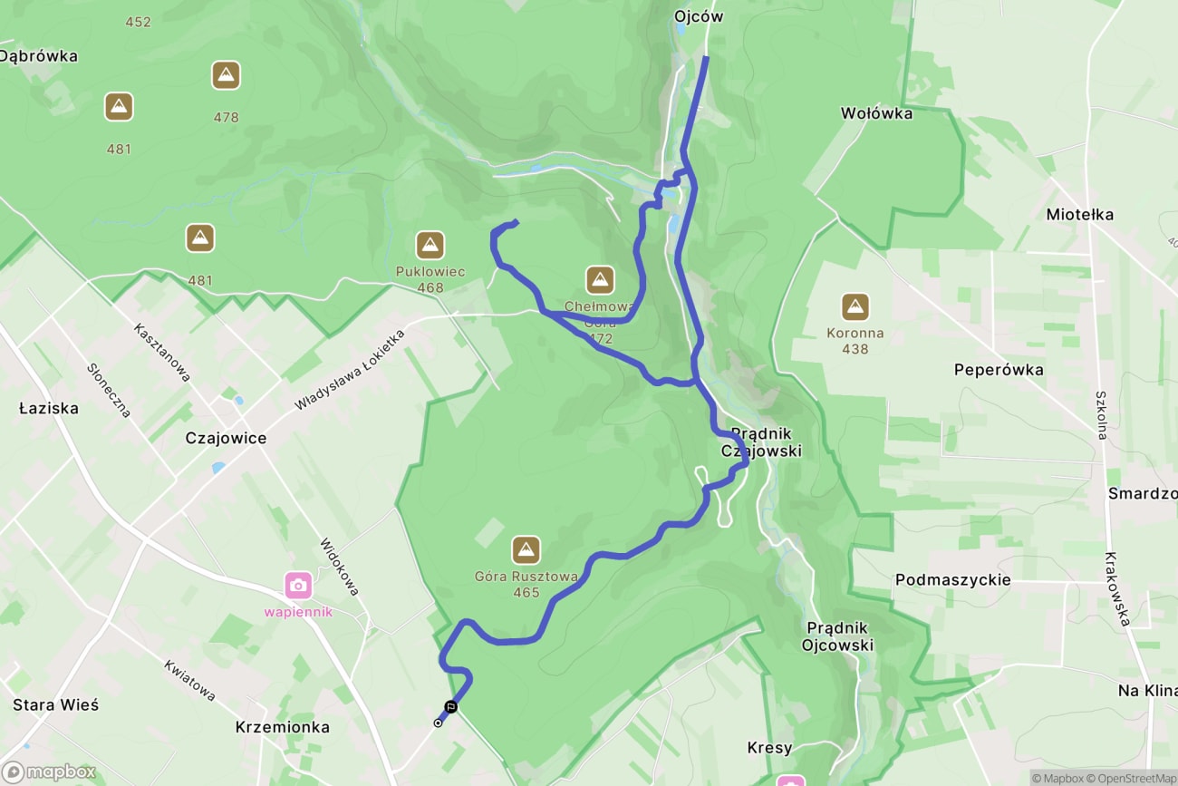 Początek trasy znajduje się przy ulicy Ojcowskiej, na wygodnym parkingu, skąd zielony szlak prowadzi w kierunku serca Ojcowskiego Parku Narodowego. Po kilku minutach marszu ścieżka skręca w prawo, ku Ruinom Zamku Kazimierzowskiego. Z tego punktu rozciąga się widok na wapienne wzgórza Doliny Prądnika – krajobraz jest charakterystyczny dla Jury Krakowsko-Częstochowskiej, surowy, ale niezwykle malowniczy.