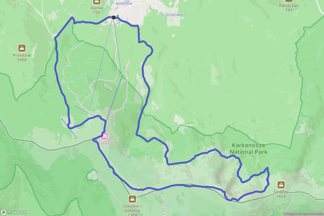 Trasa rozpoczyna się przy dolnej stacji Ski Arena Szrenica 🎿. Już na początku warto zatrzymać się przy Wodospadzie Kamieńczyka 💦. Następnie należy dostać się na Halę Szrenicką 🌲. W pobliskim schronisku możesz zaplanować pierwszy odpoczynek ☕. Dalej wspinasz się na Szrenicę (1362 m), skąd roztaczają się malownicze widoki Kotliny Jeleniogórskiej oraz Gór Izerskich 🏞️. Na kolejnym etapie miniesz formację skalną Trzy Świnki, Śmielec (1424 m), Mały i Wielki Śnieżny Kocioł ❄️, Śnieżne Stawki, aż w końcu dotrzesz na Wielki Szyszak (1509 m) – kulminacyjny punkt całej wędrówki. Zejście prowadzi obok Schroniska pod Łabskim Szczytem i atrakcji takich jak Krąg 2000, Azyl Żelaznych Ludzi czy skałki Marianki 🪨. Ostatni odcinek trasy wiedzie przez Vysoká pláň i Łysą Górę i prowadzi do punktu startu.